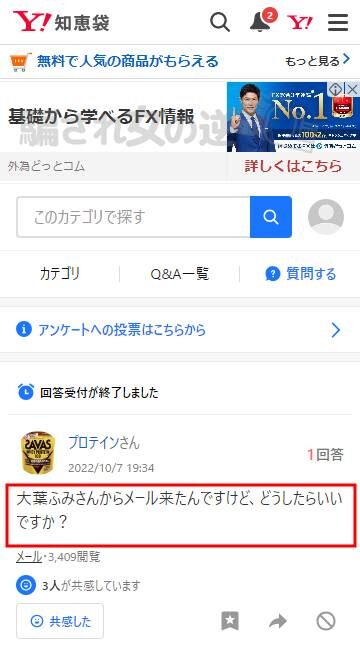 Yahoo!知恵袋でも大葉ふみって方からメールが届いたって情報を見つけたけど、まさか身近にもメールが届いていた人がいたなんて!!もしかしたら、皆さんにも届いてるかもしれません!返信しないように気を付けてくださいね。